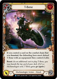 If you control a card on the combat chain that was boosted, the defending hero must defend T-Bone with an equipment they control if able.